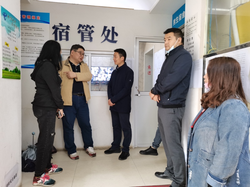 在32栋学生宿舍,学院领导和老师深入了解了32栋宿舍的基本情况,要求尽快落实宿舍过道照亮灯、学生晾衣、宿舍马桶故障等学生生活服务设施的维修工作。在宿舍31栋,领导一行查看了学生公告栏、门卫室消杀记录、班主任走访登记表,并详细查看了二楼辅导员值班宿舍的情况。学工部相关同志介绍了学生宿舍访谈、紧急情况处置流程以及日常安全管理工作的具体举措和落实情况。随后,领导一行对宿舍楼消防设施、消防通道的设置、疫情防控物资准备进行了检查,并听取了相关负责人对在宿舍内开展线上教学和学生教育管理工作的情况汇报。