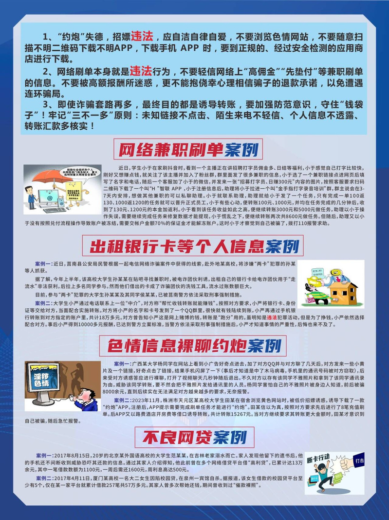 学院通过“线上+线下”立体化宣传,将反诈教育融入日常管理。一方面,组织全体学生签订《反诈承诺书》,在学院520间宿舍张贴警示标语和案例海报,进一步加大宣传力度,营造全员反诈氛围;另一方面,建立“辅导员-班委-宿舍长”三级联防网络,实现信息的快速传递和响应。此外,建立家校联动机制,建议家长采用“按月给生活费”的方式,避免学生因大额资金流动陷入骗局。学院还对涉事学生开展心理疏导,并在全院通报案件处理结果,以案为鉴强化警示教育。