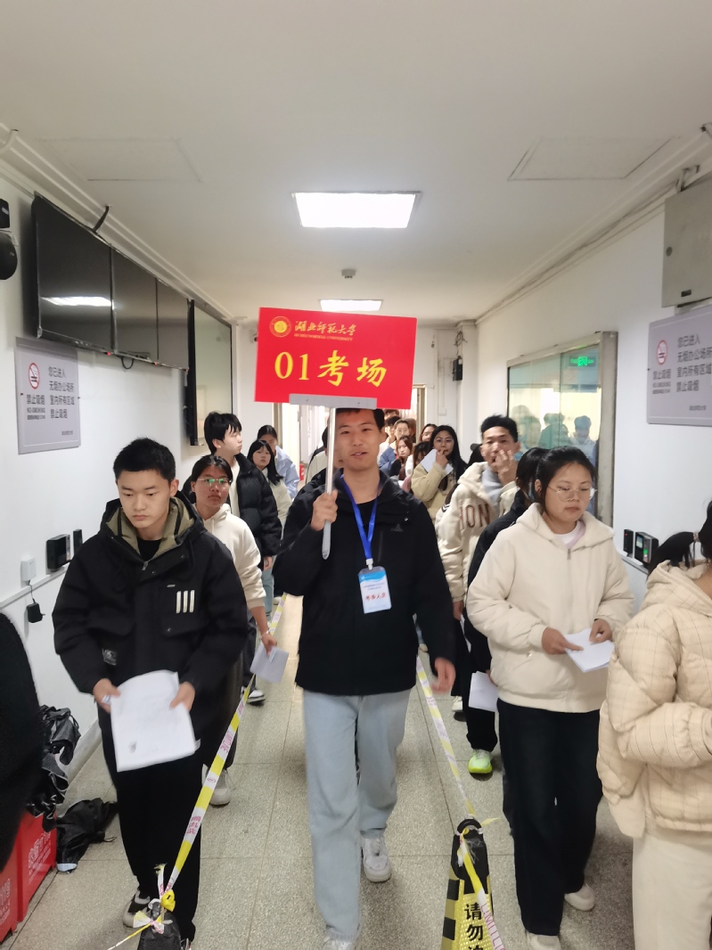为确保考试有序进行,每个考场设立了对应的候考室,由工作人员核验身份并整队引导考生有序进入考场,在入口处一楼大厅专门设立了手机和物品存放点,考试组织工作秩序井然。